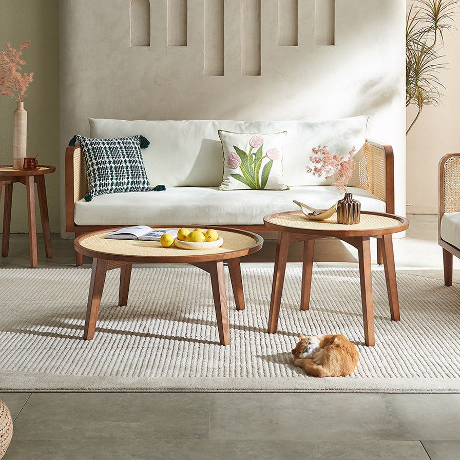 The Isla Rattan Coffee Table captures effortless charm with its smooth round silhouette and handwoven rattan top. Crafted from natural wood, it brings a light, airy feel to any space—perfect for coastal, bohemian, or modern interiors. A simple yet striking centerpiece that invites relaxed elegance.