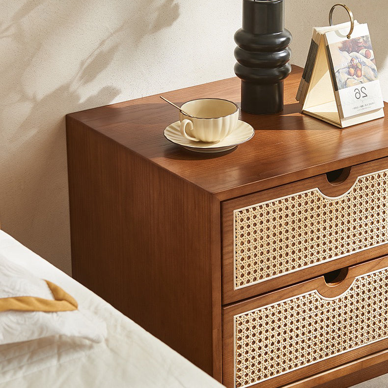 Each drawer features a woven rattan front, adding warmth and texture to the clean-lined silhouette. The sturdy solid wood frame ensures long-lasting durability, while the spacious tabletop provides the perfect spot for a lamp, books, or decorative accents.